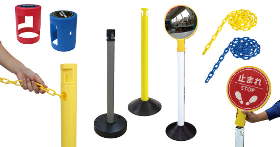 使用用途に合わせてピラー(柱)、チェーン、ベース(土台)のカラーやオプションパーツを選んでいただくことが可能です。ベースもポリエチレンとゴム製から選べます。
